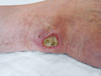 A pressure ulcer (decubitus ulcer) is a localized injury to the skin and/or underlying tissue, usually over a bony prominence. This type of ulcer is the result of pressure, or pressure in combination with shear (2). The pressure prevents the blood from circulating properly, and causes cell death, tissue necrosis and the development of ulcers. Wheelchair users or people confined to a bed (for example, after surgery or an injury) are especially at risk.